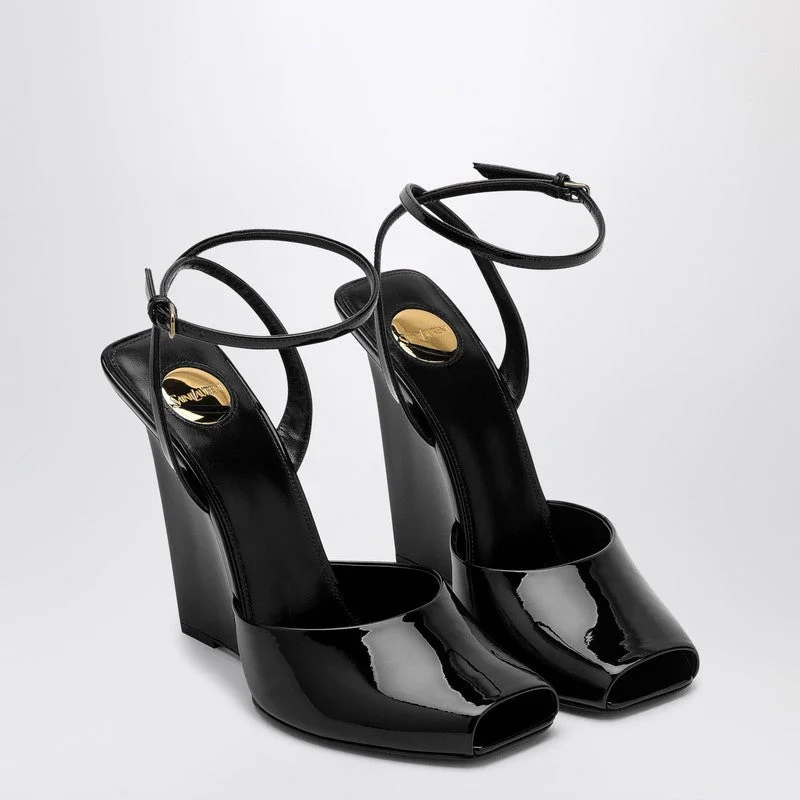 Saint Laurent black patent leather wedge, characterized by a square toe, adjustable ankle strap, metal logo tag on the insole, and leather sole. Heel 11 cm Size Type: IT Material: Leather SKU: 8060391TV00/PYSL1000500 Our Products Are 100% Genuine. In All Cases We Stand By The Authenticity Of Every Product Sold On Our Site. All sales are final and we only accept returns for quality issue. Buyer is responsible for any import tax/duty if applicable.
