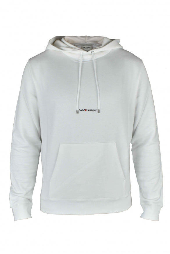 <p>Saint Laurent white hooded sweatshirt. Organic cotton terry cloth. Printed logo on chest. Drawstring hood. Kangaroo pocket. Long sleeves. Ribbed edges. 100% cotton.</p> Size Type: Unique SKU: 677259YB2PG9000 Our Products Are 100% Genuine. In All Cases We Stand By The Authenticity Of Every Product Sold On Our Site. All sales are final and we only accept returns for quality issue. Buyer is responsible for any import tax/duty if applicable.