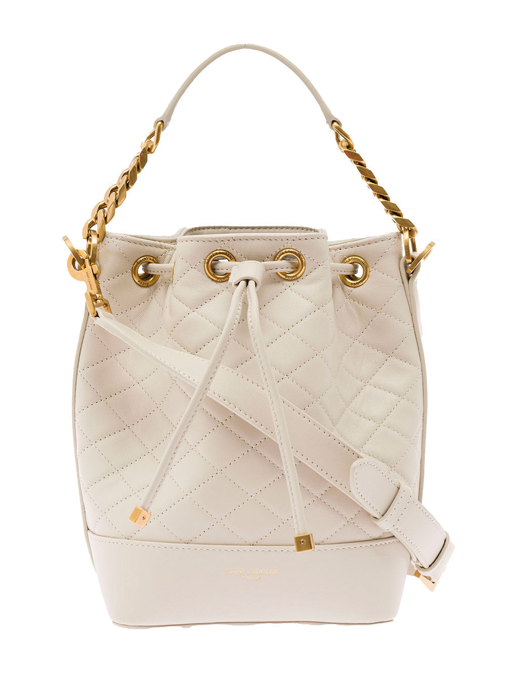 Crossbody bucket Ivory color Quilted leather One top handle with chain inserts Drawstring closure Front logo Removable and adjustable shoulder strap Single internal compartment Dimensions: 15x20x12 cm Shoulder strap length: 50 cm SKU: 6976401EL079207 Our Products Are 100% Genuine. In All Cases We Stand By The Authenticity Of Every Product Sold On Our Site. All sales are final and we only accept returns for quality issue. Buyer is responsible for any import tax/duty if applicable.