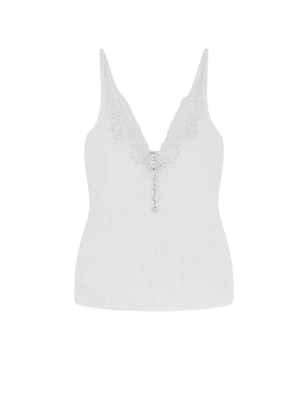 Viscose top with lace inserts Adjustable thin straps Crystal buttons on the front V-neckline with lace inserts Ribbed knit 62% viscose 38% polyester ID PF25042TW Viscose | MAIN:62%VIS 38%PES LACE:88%PA 12%EA KG 0,5 Size Type: INT SKU: PF25042TWWhite Our Products Are 100% Genuine. In All Cases We Stand By The Authenticity Of Every Product Sold On Our Site. All sales are final and we only accept returns for quality issue. Buyer is responsible for any import tax/duty if applicable.