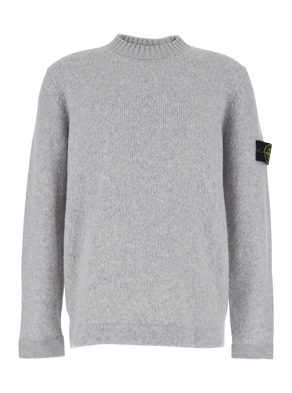 Stone Island Men Grey Ribbed Knit Crewneck Sweater With Logo Patch On The Sleeve In Wool Man