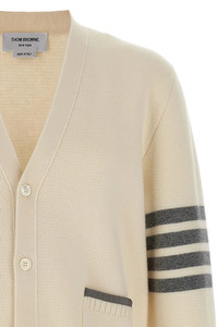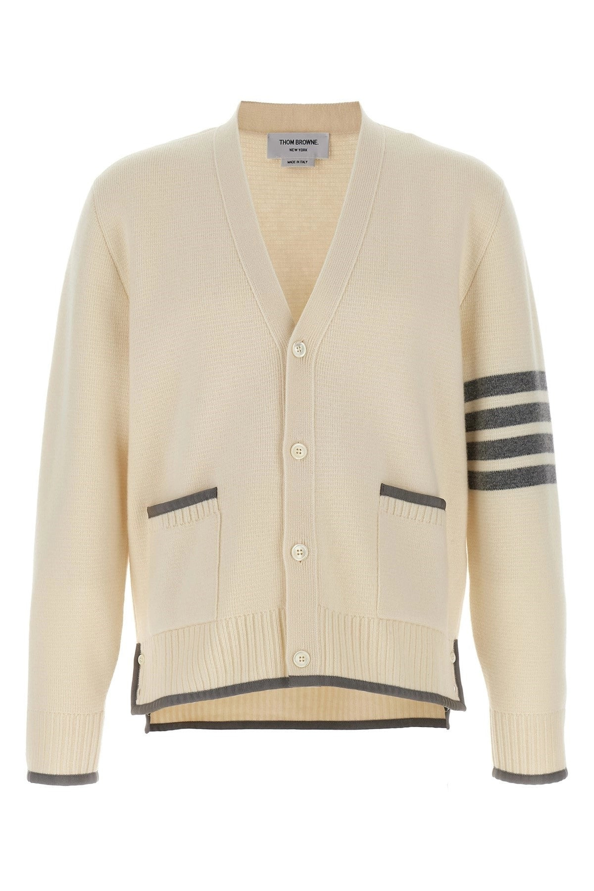 Milan stitch virgin wool cardigan with jacquard '4-Bar' detail on the sleeve and grosgrain piping, V-neck, front button closure, pockets, long cuffed sleeves, side slits, and asymmetrical hem. Color: White Size & Fit: True to size fit Composition: 100% virgin wool Made in: Italy SKU: MKC608AY1029100 Our Products Are 100% Genuine. In All Cases We Stand By The Authenticity Of Every Product Sold On Our Site. All sales are final and we only accept returns for quality issue. Buyer is responsible for any import tax/duty if applicable.