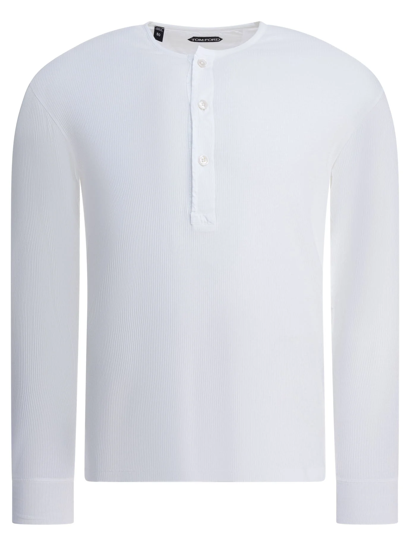 Tom Ford "Henley" T-shirt features a stretch-cotton construction, featuring a crew neck design and a series of buttons on the front. The silhouette follows essential lines, with a straight hem and long sleeves. The fabric offers a compact, uniform surface designed to hold its shape over time. All functional elements are integrated without accessory embellishments or overlays. || - Solid color - Long sleeves - Crew neck - Front buttons - Straight hem - Regular fit 95% cotton 5% elastane SKU: JHL019JMC067AW002 Our Products Are 100% Genuine. In All Cases We Stand By The Authenticity Of Every Product Sold On Our Site. All sales are final and we only accept returns for quality issue. Buyer is responsible for any import tax/duty if applicable.