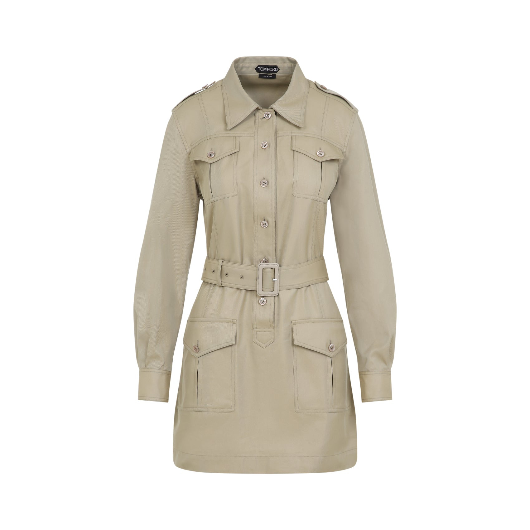 Tom Ford Pale Sage Beige Cotton Safari Mini Dress. Crafted in cotton and silk blend. Pointed collar, front buttoned fastening, buttoned flap pockets on the chest, buttoned straps on the shoulders, long sleeves, buttoned cuffs, side flap buttoned pockets, straight hem, mini-length. Cotton | 66%COTTON 34%SILK Size Type: IT SKU: AB3431FAX1215Nude&Neutrals Our Products Are 100% Genuine. In All Cases We Stand By The Authenticity Of Every Product Sold On Our Site. All sales are final and we only accept returns for quality issue. Buyer is responsible for any import tax/duty if applicable.