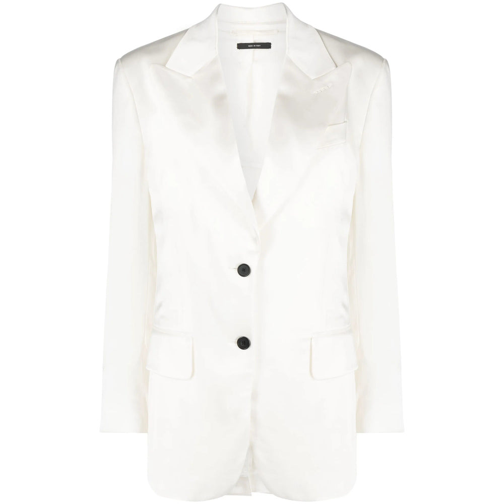 white satin finish peak lapels long sleeves buttoned cuffs front button fastening chest welt pocket two side flap pockets American rear ventMADE IN:ItalyMATERIAL:Lining Composition Polyester: 46.0%, Outer Composition Acetate: 65.0%, Outer Composition Viscose: 35.0%, Lining Composition Viscose: 54.0%COLOR:WHITE SKU: FAX727GI2916AW003 Our Products Are 100% Genuine. In All Cases We Stand By The Authenticity Of Every Product Sold On Our Site. All sales are final and we only accept returns for quality issue. Buyer is responsible for any import tax/duty if applicable.