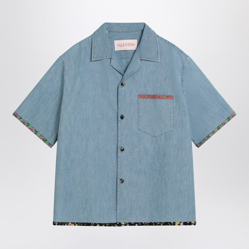 Valentino shirt in light blue cotton denim, featuring a bowling collar, short sleeves, a patch pocket on the chest, floral print edges, and a boxy fit. Model wears size 50 IT Model measurements: Height: 187 cm Chest: 100 cm Waist: 79 cm Hips: 96 cm Size Type: IT Material: Denim SKU: 6V0DB04LALM/QVALE508202 Our Products Are 100% Genuine. In All Cases We Stand By The Authenticity Of Every Product Sold On Our Site. All sales are final and we only accept returns for quality issue. Buyer is responsible for any import tax/duty if applicable.