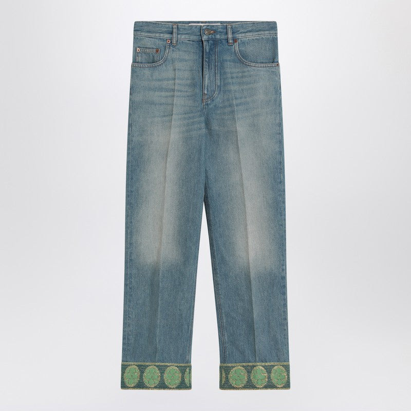 Valentino jeans in blue cotton denim with a faded effect, featuring a front zip and button closure, belt loops, five classic pockets, a hem with jacquard embroidery, and a rear logo patch. Model wears size 26 Model measurements: Height: 179 cm Chest: 82 cm Waist: 65 cm Hips: 90 cm Size Type: INT Material: Wool SKU: 6B3DD18X94V/QVALE558311 Our Products Are 100% Genuine. In All Cases We Stand By The Authenticity Of Every Product Sold On Our Site. All sales are final and we only accept returns for quality issue. Buyer is responsible for any import tax/duty if applicable.