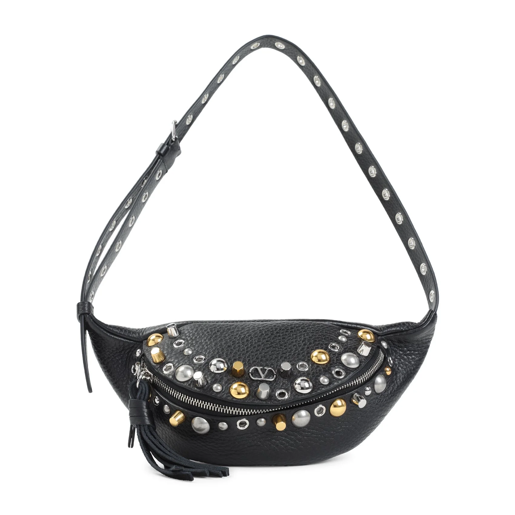 Valentino Garavani Black Calf Leather Nellcote Belt Bag. Pure black calf leather belt bag, top silver-tone metallic signature V logo, front zipped fastening, back adjustable shoulder strap, tonal stitching. Gold-tone and silver-tone studded details. Leather | 100%CALF LEATHER W:26cm H:12cm D:7cm Size Type: One Size SKU: 7Y2B0R39MJLBlack Our Products Are 100% Genuine. In All Cases We Stand By The Authenticity Of Every Product Sold On Our Site. All sales are final and we only accept returns for quality issue. Buyer is responsible for any import tax/duty if applicable.