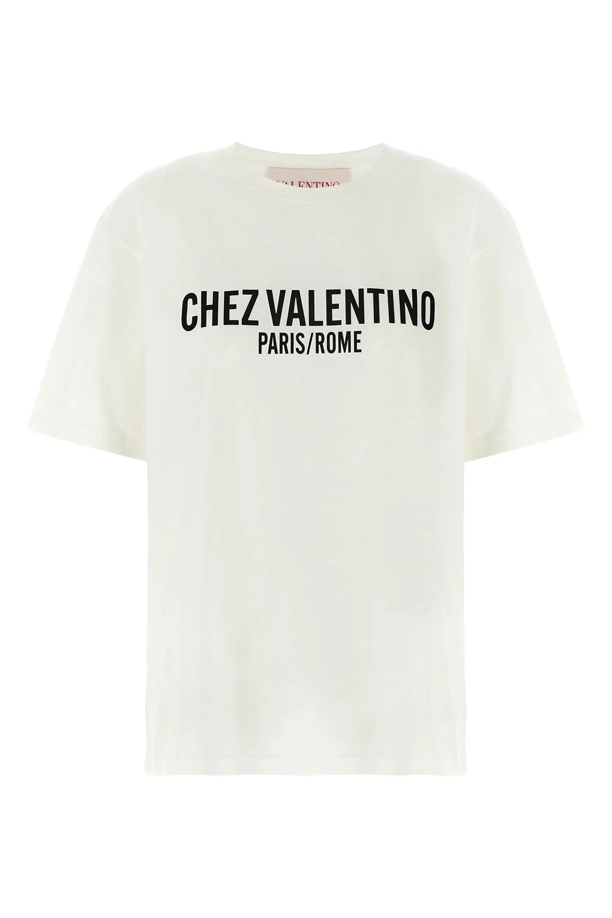 Cotton jersey T-shirt with front 'Chez Valentino' print, crew neck, short sleeves with dropped shoulders. Color: White/Black Size & Fit: Comfort fit Composition: 100% cotton Made in: Italy SKU: B3MG24Q95WA03 Our Products Are 100% Genuine. In All Cases We Stand By The Authenticity Of Every Product Sold On Our Site. All sales are final and we only accept returns for quality issue. Buyer is responsible for any import tax/duty if applicable.