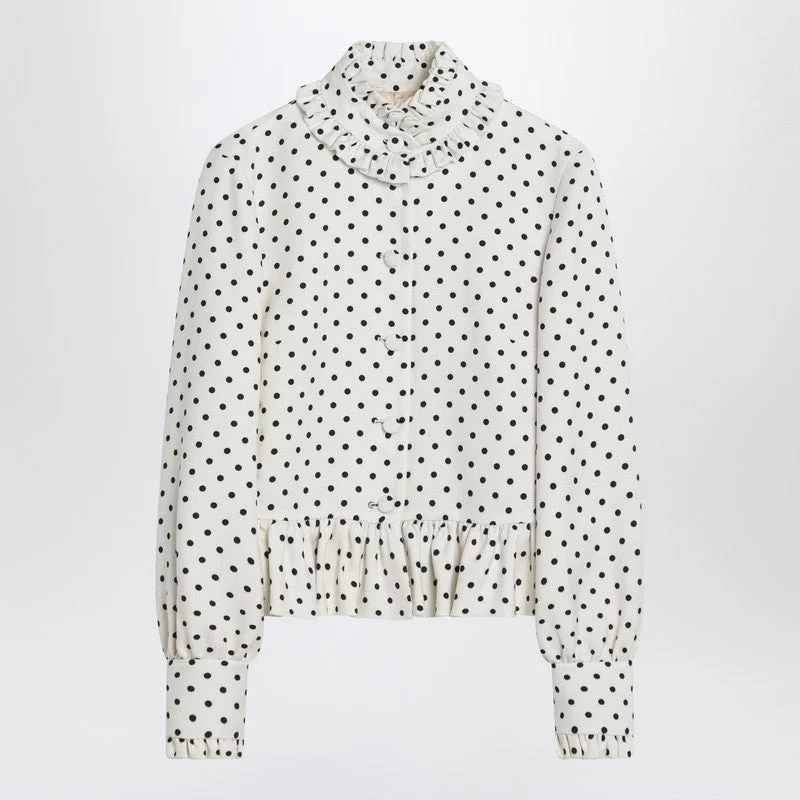 Valentino jacket in white viscose with black polka dots all over, characterized by front buttoning, raised collar with pleated edge, long sleeves with buttoned cuffs, padded shoulders, and hem with ruffle. Model wears size 40 IT Model measurements: Height: 178 cm Chest: 89 cm Waist: 62 cm Hips: 88 cm Size Type: IT Material: Viscose SKU: 6B0CE4A098S/QVALER8E102 Our Products Are 100% Genuine. In All Cases We Stand By The Authenticity Of Every Product Sold On Our Site. All sales are final and we only accept returns for quality issue. Buyer is responsible for any import tax/duty if applicable.