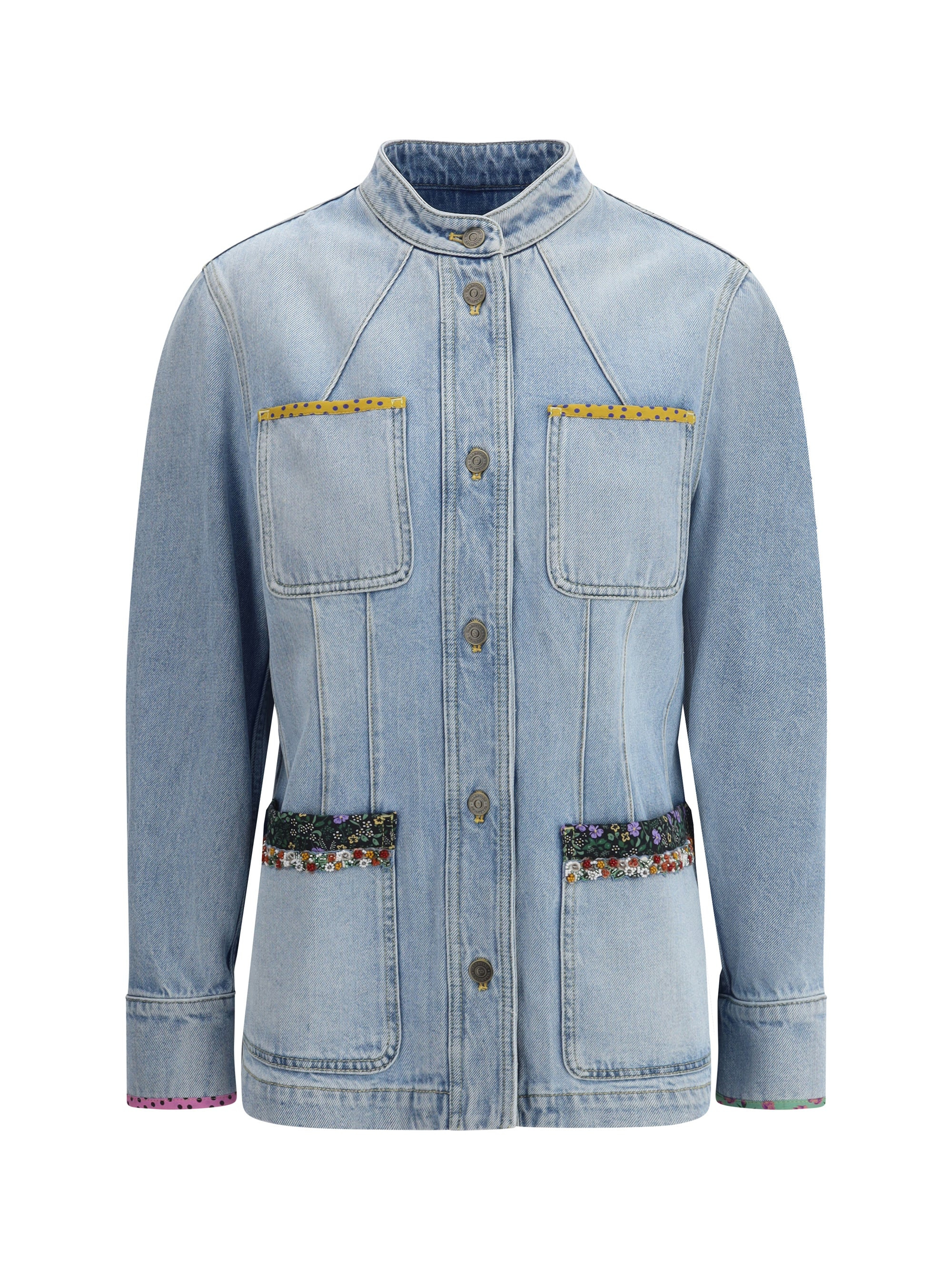 Embellished printed chiffon-trimmed denim jacket Light denim