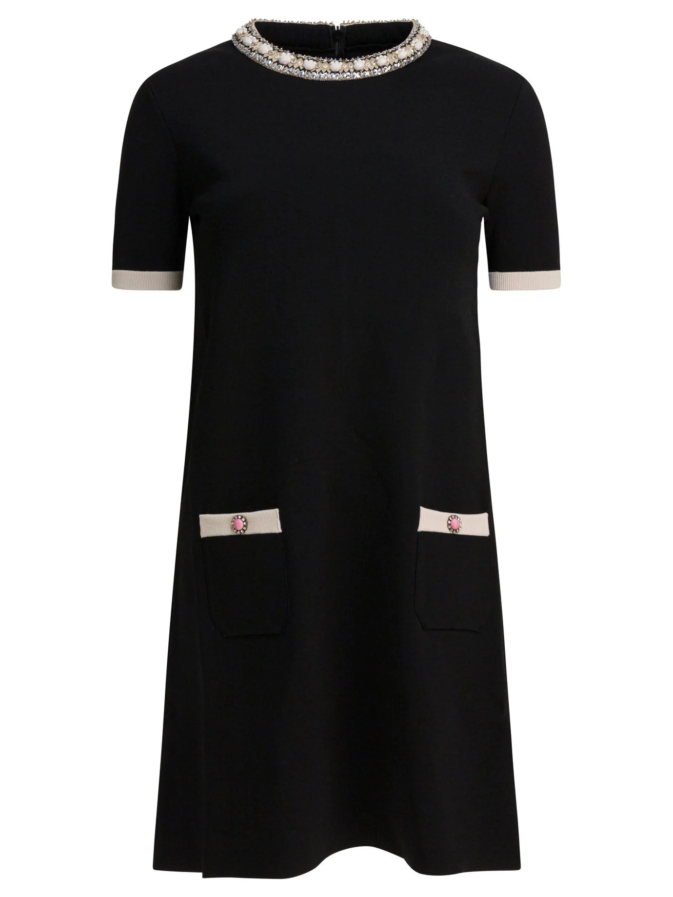 Valentino embellished crewneck dress made of viscose blend with a compact structure. The construction features a regular line and straight silhouette. The crew neck is finished with a series of applied crystals. The design features short sleeves, back zipper closure and two front pockets with jeweled button detail. The overall look is essential and defined in proportions. || - Short sleeves - Solid color - Back zipper closure - Two front pockets with jeweled buttons - Crew neck with applied crystals - Viscose blend fabric - Regular fit 83% viscose 17% polyester SKU: 6B3KD13L96B0NA Our Products Are 100% Genuine. In All Cases We Stand By The Authenticity Of Every Product Sold On Our Site. All sales are final and we only accept returns for quality issue. Buyer is responsible for any import tax/duty if applicable.