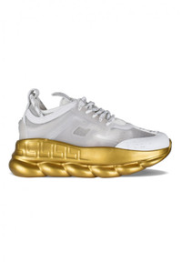 <p>Versace Chain Reaction sneakers in white nylon. White leather details. Tone-on-tone logo on visible side. Thick golden rubber chain-effect sole. Embossed jellyfish symbol on back. Lace-up closure. Round toe. Made in Italy.</p> Size Type: IT SKU: DSR705GD9TCG Our Products Are 100% Genuine. In All Cases We Stand By The Authenticity Of Every Product Sold On Our Site. All sales are final and we only accept returns for quality issue. Buyer is responsible for any import tax/duty if applicable.