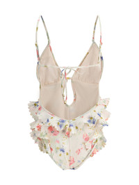 Zimmermann's Lucky Waterfall Swimsuit features a multicolored floral pattern throughout. Featuring a V-neckline and ruffle details decorating the garment, it has thin, adjustable straps, a tie-back closure, and an exposed back for an elegant and sensual look. Lined for added comfort, it is perfect for a refined summer look. Size Type: NUM SKU: 4620WSS252CRMBQFLO Our Products Are 100% Genuine. In All Cases We Stand By The Authenticity Of Every Product Sold On Our Site. All sales are final and we only accept returns for quality issue. Buyer is responsible for any import tax/duty if applicable.