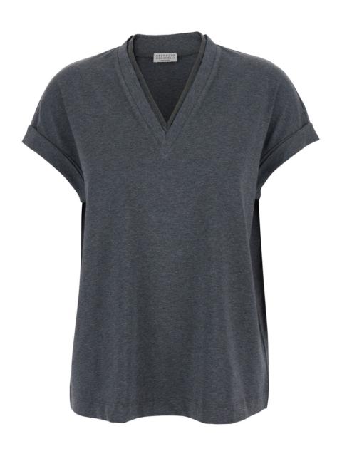 Brunello Cucinelli Women Stretch Cotton Jersey T-Shirt With Precious Faux-Layering