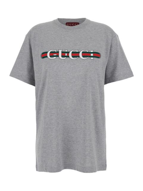 Gucci Women Grey Crewneck T-Shirt With Logo Lettering And Web Detail On The Front In Cotton Woman