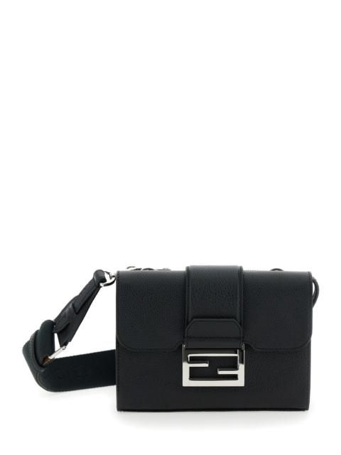 Fendi Men 'Baguette Double' Black Crossbody Bag With Ff Plaque On The Front In Hammered Leather Woma