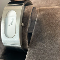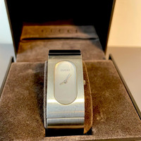 Vintage Gucci 2400 Series Collection watch. Great condition. Just had it cleaned and serviced with new battery. Dimensions • 22mm x 42mm Case Fits wrist 6.75 • Stainless Steel • Quartz Movement • Smooth Bezel • Silver Dial CASE Crystal: Sapphire Bezel Style: Smooth Case Diameter: 22mm Case Shape: Rectangle Bezel Material: Stainless Steel Case Material: Stainless Steel Watch Height: 7mm FEATURES Water Resistance