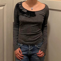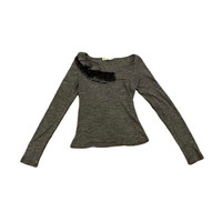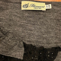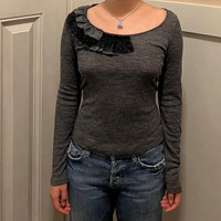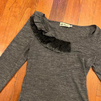 Dark heather grey round neck long sleeve sweater from late 00s. Ruffled lace tulle detail with rhinestones. Size IT 44, fits S to M , slim fit 15” pit to pit, 20.75” length Like new, nwot never worn, kept in storage Made in Italy Virgin wool , acrylic blend fabric