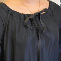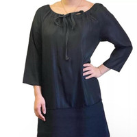 Black drop waist dress with peasant blouse style ribboned top. Top has shiny satiny tech fabric and bottom is thicker textile. Quarter sleeves. 2 front pockets. Size IT 38, slightly oversized, fits S/M Acetate, linen, cotton, silk, virgin wool, nylon blend Marni winter 2009 Same style with different pattern shown on marni model Excellent preowned condition