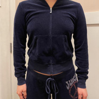 Navy vintage terry cloth jacket and pants coord from mid 2000s. Coral pink logo floral peace sign graphic on back and leg. Embellished with rhinestones. Made in America line. Hooded jacket - size M, 17” pit to pit Pants - size M, 28” inseam Like new, no wear