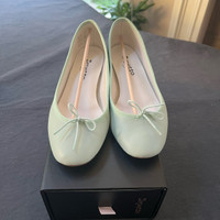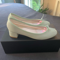 New season brand new unworn repetto ballerina block heels in aqua nappa calfskin Retail $430 Sold out, size EU 36 Comes with box and original packaging Only tried on once inside the house but they are too big for me Follows new repetto sizing Material: Nappa calfskin Color: Aqua green Heels height: 3 cm Original country: France Details: Cowhide leather insole. Cotton lining. Leather wrapped heel. Stitch-and-return. Leather sole.