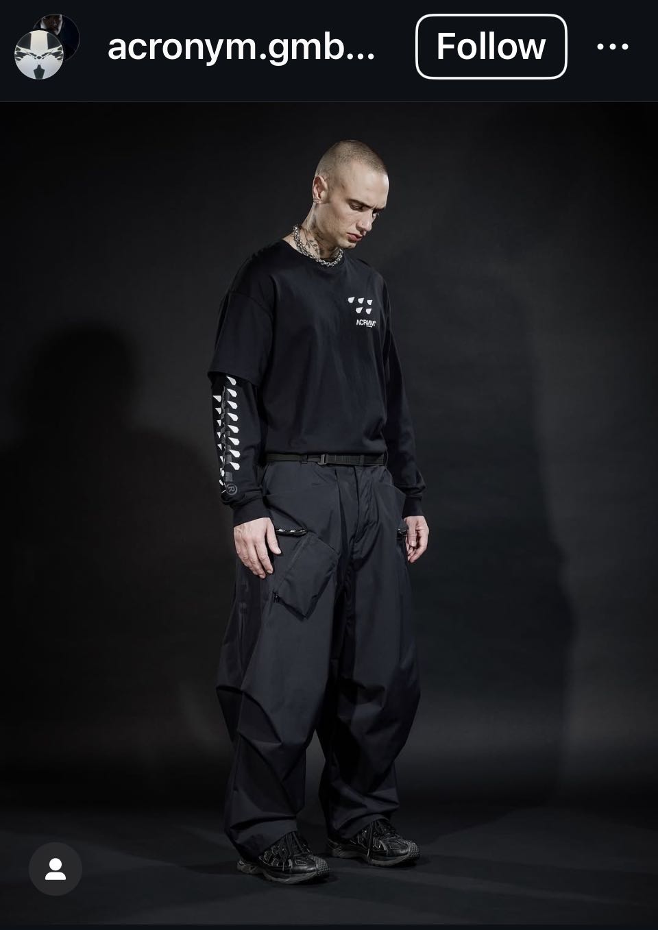 Size XS full packed Dead stock from first patch The best bottom-wear design from acronym in recent years, characterized by its emphasizing lower leg proportion and a futuristic geographical silhouette. Pairing them up with a cropped/bulky jacket, you’ll get an almost dramatic slim waist illusion.