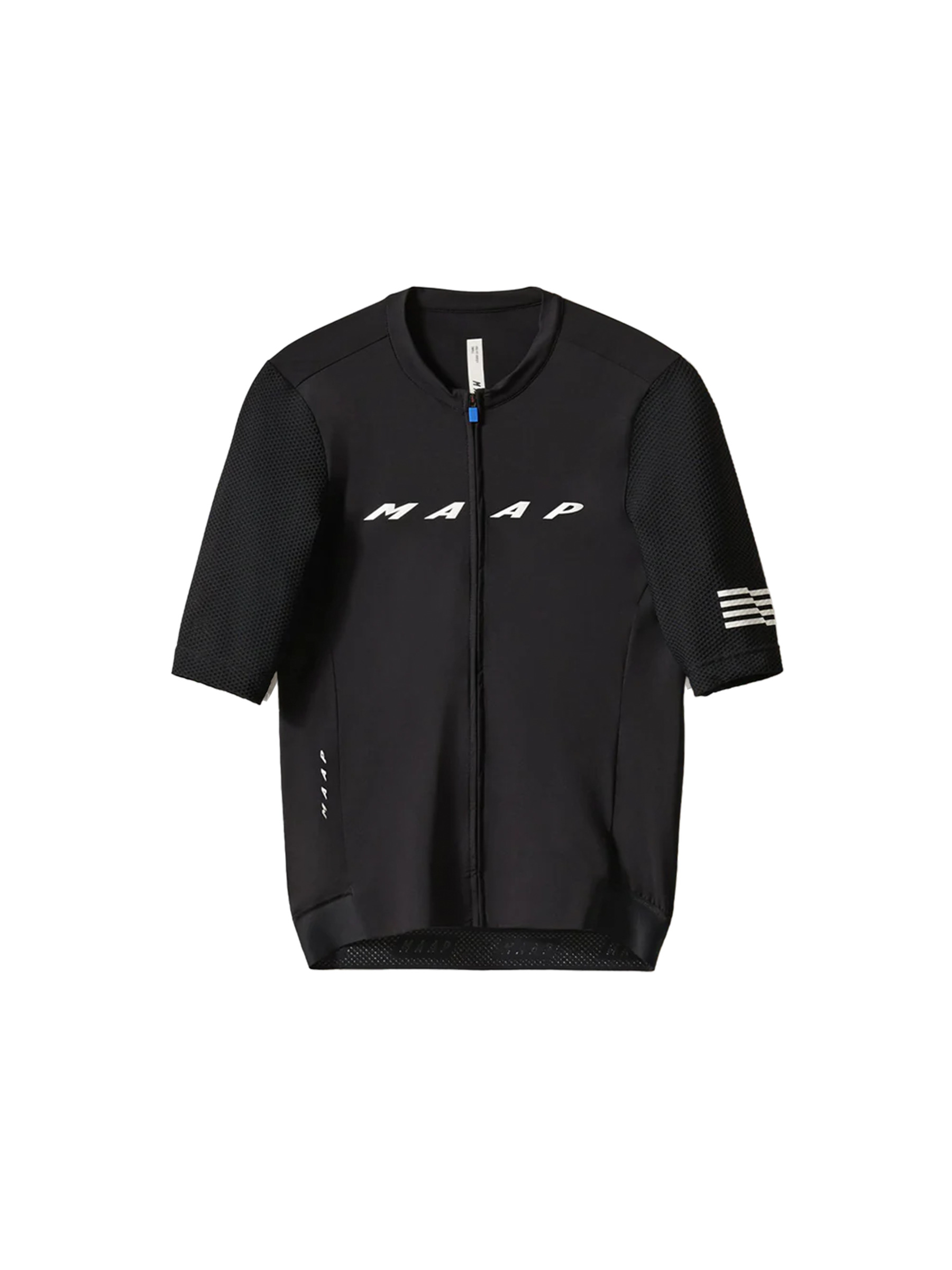Our best-selling jersey keeps getting better. The Evade Pro Base Jersey 2.0 has been re-imagined with a range of sustainable materials and fresh design details for a jersey that fits so well you'll forget you're wearing it. Ultra-soft fabrics paired with advanced moisture-wicking technology keep you cool and dry even when the pace is on. Details - Recycled Yarns - MAAP Honeycomb - Moisture Wicking - bluesign® APPROVED Fabric - Breathable Features - The signature Race Fit features a longer sleeve length, low profile collar and tailored panelling for a high-performance silhouette - The main body material is a recycled ultra-soft knitted Italian fabric offering comfort and performance without compromising MAAP's commitment to sustainability - Recycled dyed honeycomb mesh sleeves provide advanced breathability - A bonded front-hem and rear pocket edge construction reduces bulk for an elevated fit - The bonded low-profile internal rear pocket reduces bulk while providing secure storage - Reflective print transfers and tabs for extra visibility in low light conditions Specifications - Product Weight: 160 g - 5.64 oz - Main Fabric Content: MAIN BODY: 70% POLYAMIDE (RECYCLED), 30% ELASTANE, SLEEVES: 78% POLYAMIDE (RECYCLED), 22% ELASTANE - Fit: Race - Temperature Range: 18- 35 DEGREES - Riding Conditions: Hot - SKU: MAP-MAJ339_BLK