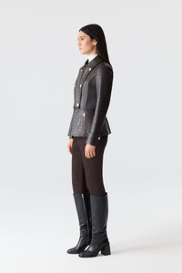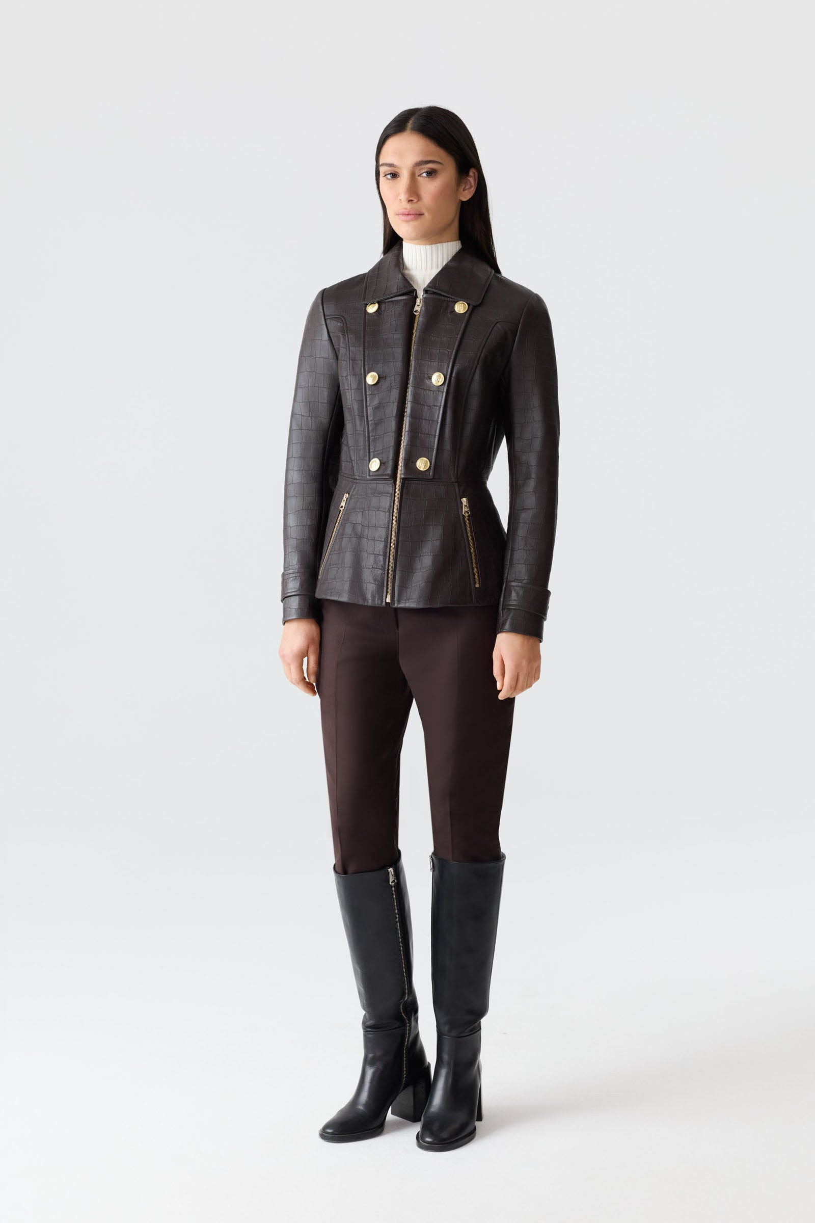BARBARA-NV is a fitted jacket crafted from 100% lamb leather with a croc-embossed patterned finish. Featuring a peplum hem for a sculpted silhouette, it is fully lined and designed with a wide collar and double-breasted front. Adjustable sleeve tabs with buttons and zippered pockets add both functionality and elevated detailing. DETAILS - Fitted leather jacket - 100% lamb leather with croc-embossed patterned finish - Peplum hem - Wide collar with double-breasted closure - Center front zipper closure - Adjustable sleeve tabs with buttons - Zippered front pockets - Gold hardware - Fully lined SIZE & FIT - FITTED – Our signature fit, closest to the body. - Designed to be worn with light layers, all while keeping you warm. - For heavier layering, we recommend sizing up. - The model is 5'11" (180 cm) and wears a size S. - Coat length from shoulder to hem: 24.25'' / 62 cm. COMPOSITION & CARE - Shell: 100% lamb leather. Lining: 100% polyester. - Dry clean by leather specialist using oil based solvent only. Do not use perchloroethylene.