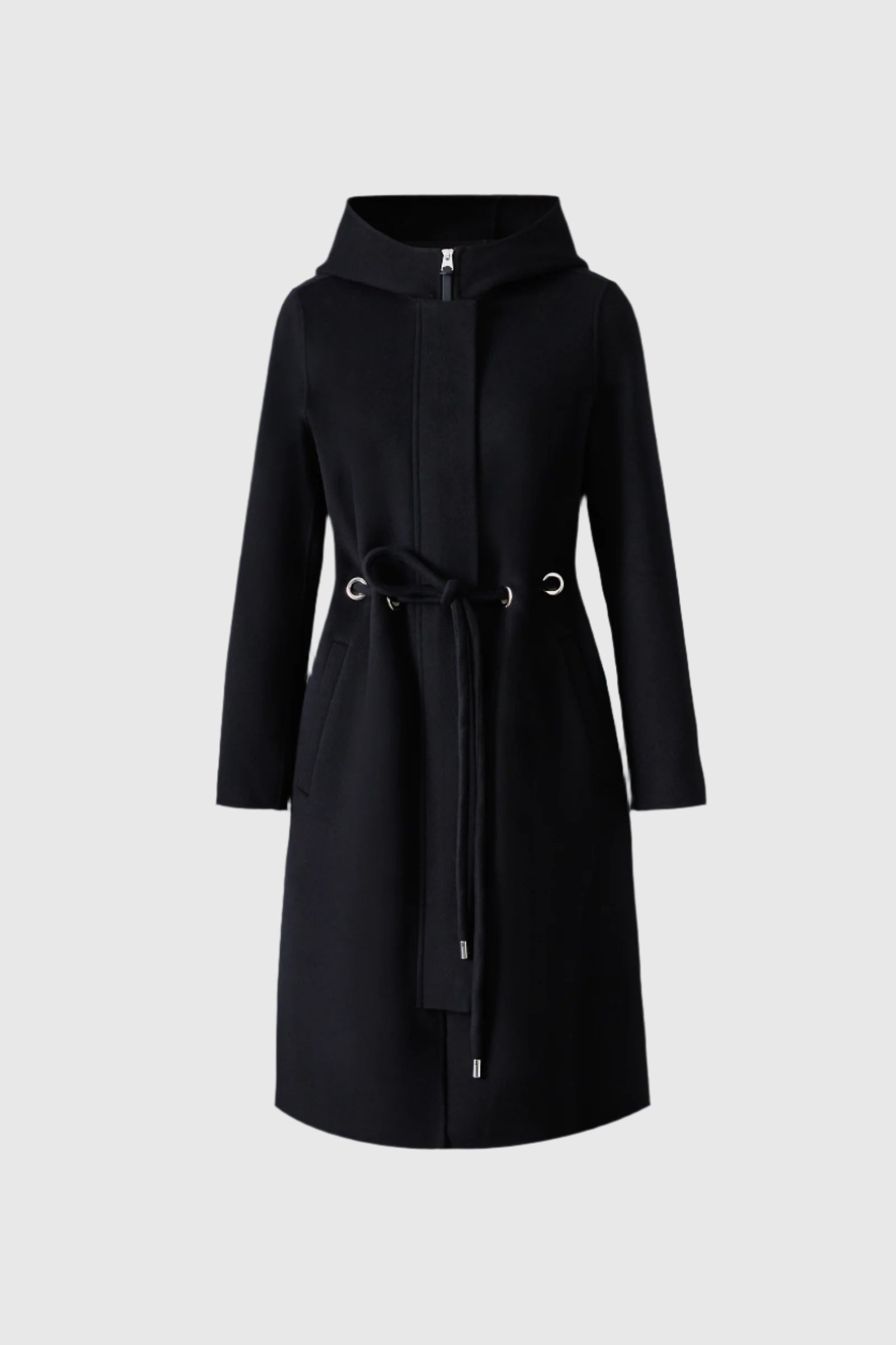 BLITHE is an elegantly handcrafted coat made from luxurious double-face wool. This straight-fit silhouette features a center front zipper closure hidden by a placket with snaps for a seamless look. The non-removable hood, welt pockets, and handmade details underscore its premium craftsmanship. A wool rope belt cinches the waist, enhanced by metal eyelets for durability and style. Enduring style with updated functionality. DETAILS - Handmade wool coat - Temperature rating: -5°C - Unlined for a sleek drape - Center front zipper closure with hidden snaps - Non-removable hood for added warmth - Welt pockets - Wool rope belt with metal eyelets on the waistline - Straight fit SIZE & FIT - STRAIGHT – Classic fit allowing comfort and style. - The model is 5'11" (180 cm) and wears a size S. - Coat length from shoulder to hem: 41.25'' / 105 cm. COMPOSITION & CARE - Shell: 100% wool. - Dry clean by a leather specialist using only oil-based solvent. Do not use perchloroethylene.