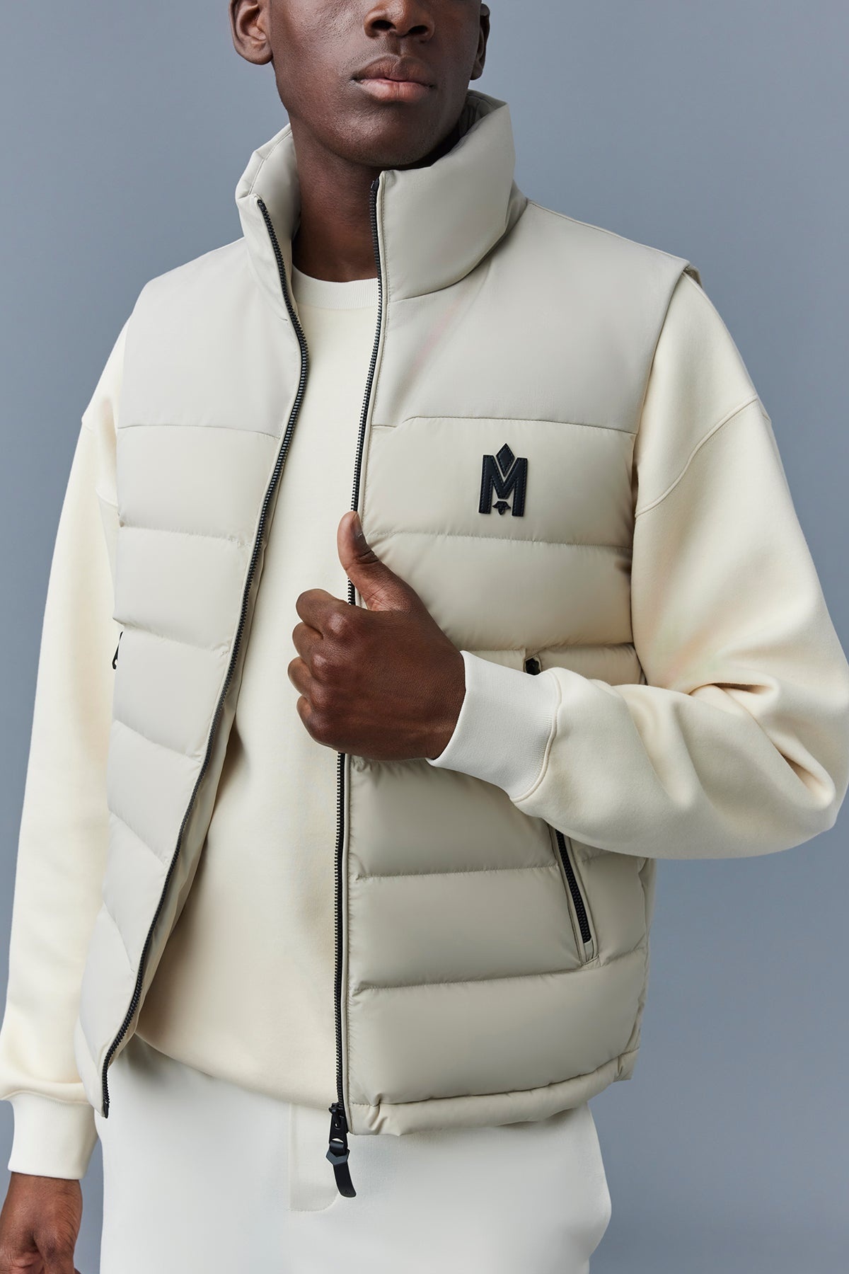 BOBBIE is an AGILE-360 ultra light recycled down vest for men with a zip front closure. The soft quilted shell is enhanced with 2-way stretch for a comfortable feel. Contrast twill accents the yoke and stand collar. Outsized insulated zip pockets offer storage while the drawcord hem adds warmth. A modern classic for failsafe year-round layering. - AGILE-360 ultra light stretch down vest - Traceable and recycled goose down - 800 fill power - Light: Down to 0°C - 2-way stretch shell - Channel quilt stitching - Contrast twill yoke and collar - Center front zip closure with stand collar - Insulated long zip waist pockets - Adjustable drawcord at hem - Signature M logo patch on left chest - Regular fit SIZE & FIT - REGULAR – Classic fit allowing comfort and style. - Designed to be worn with heavier layers. - Coat length from shoulder to hem: 30'' / 76.2 cm. COMPOSITION & CARE INSTRUCTIONS - Shell : 82% polyamide/nylon, 18% elastane/spandex. Combo shell: 70% polyester, 30% rayon. Lining : 82% polyamide/nylon, 18% elastane/spandex. Filling : 90% goose down. 10% chinese goose feathers. Water-repellent & water-resistant. - Dry clean by leather specialist using oil based solvent only. Do not use perchloroethylene.