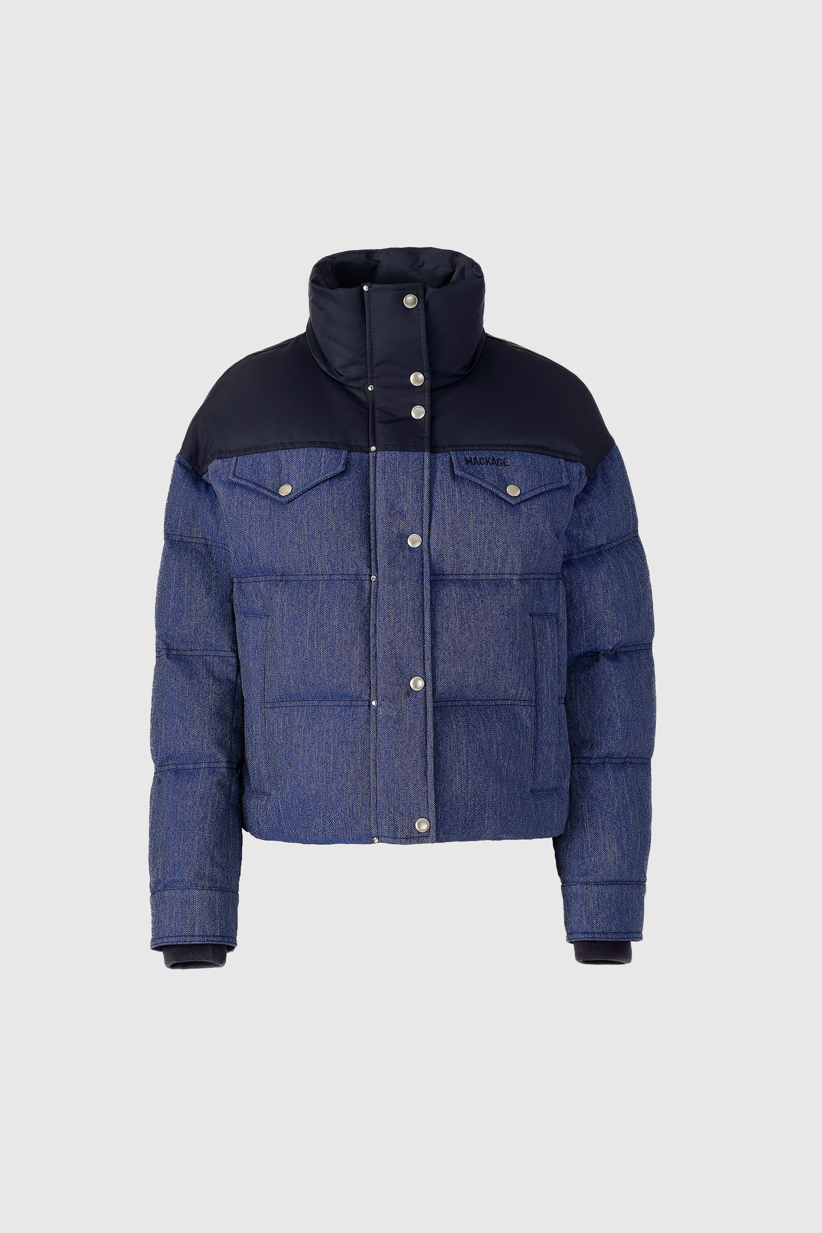 BRIGIT-DNM is a GRS-certified recycled down jacket featuring a performance denim shell with a contrast satin yoke. Designed for cold-weather layering, it includes a center front zip closure with snap placket, adjustable cuffs, and underarm eyelets for added breathability. The relaxed silhouette blends functional warmth with elevated utilitarian styling. DETAILS - Performance denim down jacket - GRS-certified recycled down - Deep Cold: Down to -15°C - Water-resistant and repellent - Contrast satin yoke with quilted body - Water-resistant and downproof - Center front zip closure with placket and snaps - Chest flap pockets with snap closures - Insulated welt waist pockets with zip openings - Adjustable sleeve cuffs and bungee hem - Underarm eyelets for ventilation - Rib knit cuffs and inner pocket - “MACKAGE” embroidery at pocket - Rivet detailing - Machine washable SIZE & FIT - RELAXED – Loose fit for on the go comfort. - Designed to be worn with heavier layers. - The model is 5'11" (180 cm) and wears a size S. - Coat length from shoulder to hem: 22.5'' / 57 cm. COMPOSITION & CARE - Shell: 100% polyester. Lining: 100% recycled nylon. Filling: 90% recycled down, 10% recycled feathers. Water-repellent, water-resistant. - Close zippers. Remove all removable trims. Wash inside out. Wash in domestic machine in water not exceeding 30°C at delicate gentle setting. Use mild detergent. Remove garment promptly from washer. Do not soak.Tumble dry at low heat with tennis balls, until fully dried (1 to 3 hours). Do not wet-clean. Do not bleach. Do not wring. Iron with or without steam by hand, or press using commercial equipment at low temperature (not exceeding 110°C). Do not dry clean.