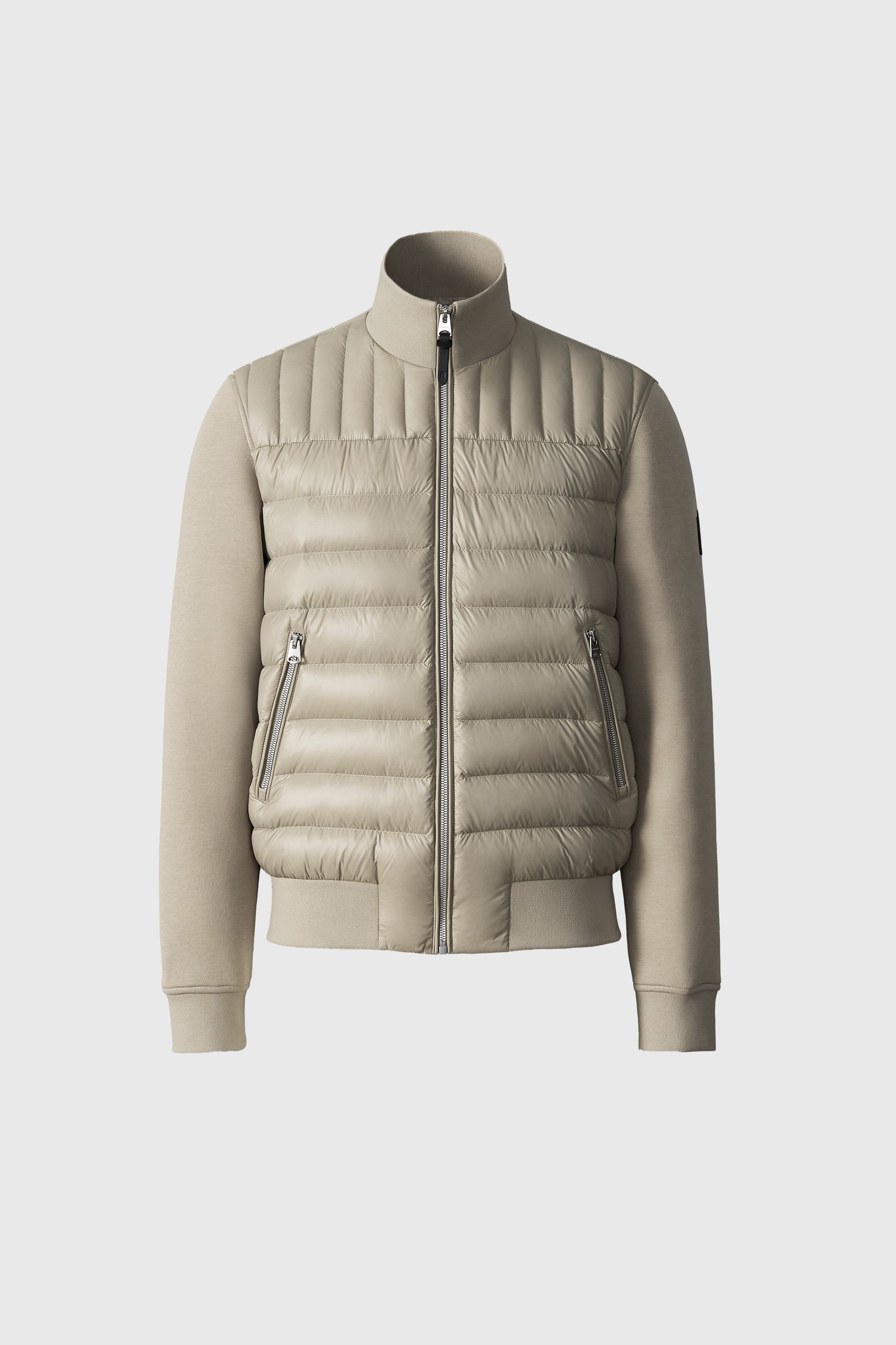 COLLIN-R is an transitional jacket for men with a classic bomber style. Expertly tailored to slim fit, it features a recycled lustrous nano down front contrasted with soft double face jersey sleeves and back. The rib knit stand collar and trims add tactical detailing and warmth. A modern multi-season layer with effortless style. DETAILS - Mixed media transitional jacket - Bomber style - Recycled lustrous light nano down front - Double-face jersey sleeves and back - Centre front zip closure - Rib knit stand collar - hem and cuffs - Zip waist pockets - Signature M logo patch on left sleeve - Machine washable - Slim fit SIZE & FIT - SLIM – Our signature fit, closest to the body. - Designed to be worn with light layers, all while keeping you warm. - For heavier layering, we recommend sizing up. - The model is 6'2" (187 cm) and wears a size L. - Length from shoulder to hem: 26 ½'' / 67 cm. COMPOSITION & CARE - Shell: 53% cotton, 47% polyester. Combo Shell 1: 100% recycled nylon. Lining: 100% recycled nylon. Filling: 90% GRS-certifed duck down, 10% feathers. Water-repellent & water-resistant. - Close zippers. Remove fur. Remove the puller. Wash inside out. Wash in domestic machine in water not exceeding 40°C, at normal setting. Use mild detergent. Remove immediately after washing. Do not soak. Tumble dry low heat with tennis balls, until fully dried (1to 3 hours). Do not wet-clean. Do not bleach. Do not wring. Do not iron or press. Dry clean using oil based solvent only. Do not use perchloroethylene.