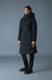 CORALIA-CITY is a fitted, long down coat engineered for cold-weather protection without the bulk. Featuring a water-resistant zipper at the center front and pockets, this streamlined silhouette includes a hood with an adjustable storm visor, insulated interior, and storm cuffs. A removable belt with buckle allows for a customizable cinch at the waist, while the recycled down fill ensures superior warmth. Finished with “MACKAGE” silicone branding on the chest for signature appeal. DETAILS - Long down coat in matte finish - Center front zipper and placket with hidden snaps - Water resistant zipper at center front and pockets - Hood with adjustable storm visor - Adjustable hood opening with bungee cord and stopper - Adjustable belt with buckle - Fully lined - Rib knit cuffs - Inner welt pocket with zipper - Insulated pocket - Quilted sleeves and quilted body - “MACKAGE” silicone branding on chest - Storm cuffs - Machine washable - Temperature rating: -15°C SIZE & FIT - FITTED – Our signature fit, closest to the body. - Designed to be worn with light layers, all while keeping you warm. - For heavier layering, we recommend sizing up. - The model is 5'11" (180 cm) and wears a size S. - Coat length from shoulder to hem: 42'' / 51 cm. COMPOSITION & CARE - Shell: 82% recycled nylon, 18% elastane/spandex. Lining: 82% recycled nylon, 18% elastane/spandex. Filling: 90% recycled down, 10% recycled feathers. Water-repellent, water-resistant. - Dry clean by leather specialist using oil based solvent only. Do not use perchloroethylene.