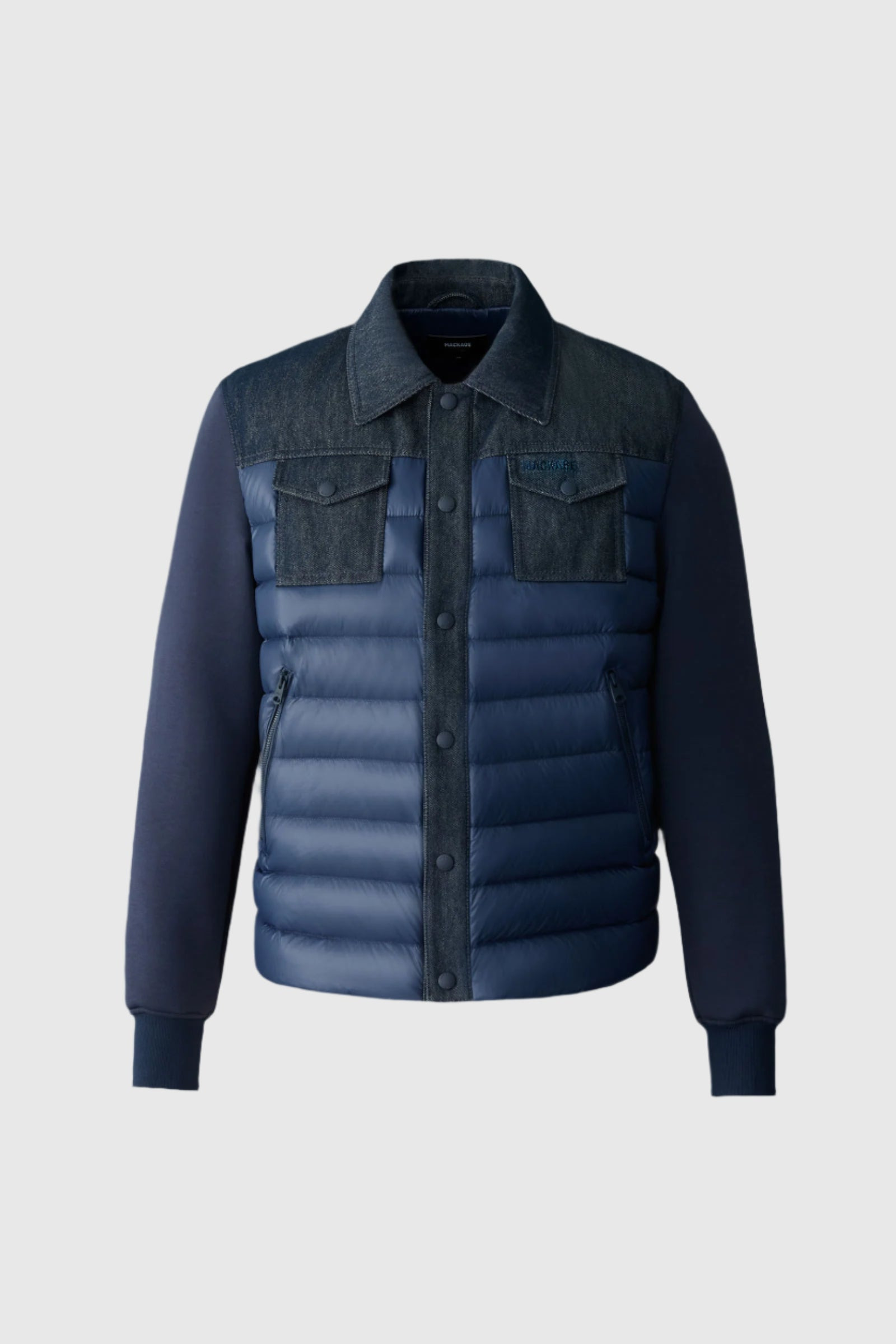 DONOVAN is a versatile jacket combining lustrous down with denim detailing for an elevated layered look. Featuring patch and zippered pockets, a denim yoke and collar, and subtle branding at the pocket, it delivers a refined utilitarian style. Rib knit cuffs and detailed piping complete the look. DETAILS - Quilted contrast fabric jacket - Double face jersey back body and sleeves - Shirt collar - Center front placket with snaps - Patch pocket with "MACKAGE" embroidery - Pockets with zippers - Contrast yoke and patch pockets - Front yoke + back yoke in denim - Collar in denim - Patch pocket + pocket flaps in denim - Rib knit cuff - Partially lined - Piping detail SIZE & FIT - REGULAR – Classic fit allowing comfort and style. - Designed to be worn with heavier layers. - The model is 6'2" (187 cm) and wears a size L. - Coat length from shoulder to hem: 26'' / 90 cm. COMPOSITION & CARE - Shell: 53% cotton, 47% polyester. Lining: 100% recycled nylon. Filling: 90% recycled down, 10% recycled feathers. - Dry clean by leather specialist using oil based solvent only. Do not use perchloroethylene.