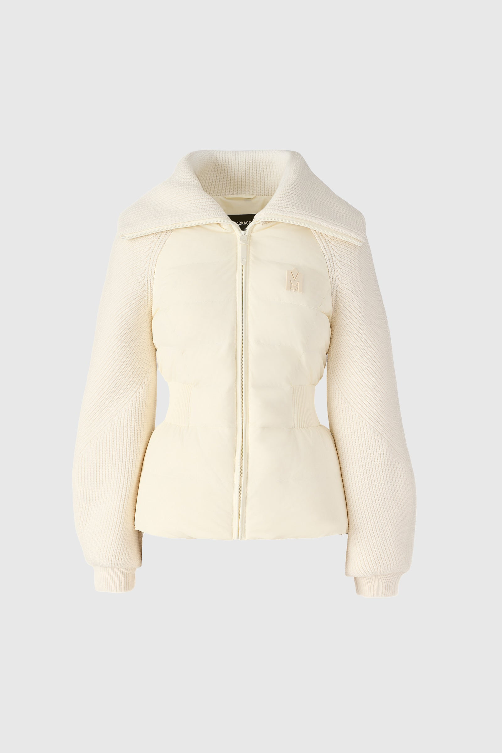FOXY is a mixed-media jacket featuring a recycled light down front and back. An expertly tailored indoor-outdoor style with knit sleeves and collar. The smocked elasticized detail at waist creates a cinched silhouette while insulated balloon sleeves add modern styling and warmth. - Mixed-media jacket - GRS-certified recycled down - Water-repellent, resistant, and windproof - Knit sleeves, back, and collar - Balloon insulate sleeves - Smocked elasticized detail at waist - Centre front zip front closure - Zip waist pockets - Signature M logo at chest - Fitted cut - Down to -15°C SIZE & FIT - FITTED – Our signature fit, closest to the body. - Designed to be worn with light layers, all while keeping you warm. - For heavier layering, we recommend sizing up. - The model is 5'11" (180 cm) and wears a size XS. - Coat length from shoulder to hem: 25'' / 64 cm. COMPOSITION & CARE INSTRUCTIONS - Shell: 82% recycled nylon, 18% elastane/spandex. Combo shell: 100% wool. Lining: 82% recycled nylon, 18% elastane/spandex. Filling: 90% duck down, 10% feathers. Water-repellent and water-resistant. - Dry clean by leather specialist using oil-based solvent only. Do not use perchloroethylene.