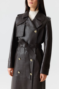 GAEL-NV is a double-breasted trench coat crafted from leather with a croc-embossed finish. The wide notched lapel, button collar latch, and asymmetrical rain shed bring striking lines to the flowing silhouette. The relaxed fit is defined by a removable sash belt and adjustable sleeve tabs while welt waist pockets, epaulettes, and painted edges show subtle yet elevated tailoring. A timeless piece with modern flair, perfect for layering through the season. DETAILS - Maxi-length trench coat - Croc-embossed lamb leather - Double-breasted front closure with buttons - Wide notched lapel with detachable throat latch - Rain shedders at front and back - Removable sash belt - Adjustable sleeve cuffs with buttons - Welt waist pockets - Vent at center back - Epaulette-style shoulder tabs - Fully lined - Edgepainted finish - Relaxed fit SIZE & FIT - RELAXED – Loose fit for on the go comfort. - Designed to be worn with heavier layers. - The model is 5'11" (180 cm) and wears a size S. - Coat length from shoulder to hem: 47.5'' / 62 cm. COMPOSITION & CARE - Shell: 100% lamb leather. Lining: 100% polyester. - Dry clean by leather specialist using oil based solvent only. Do not use perchloroethylene.