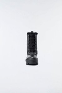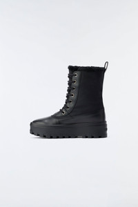 HERO-W is a handcrafted lace-up winter boot for women lined in luxuriously plush shearling for superior warmth. A waterproof membrane and signature rubber lug tread sole ensure traction and protection in the coldest temperatures. A stylish staple boot for winterproof utility. DETAILS - Mid-calf lace-up winter boot - Arctic Rated: Down to -35°C - Shearling-lined - Logo on back heel - Waterproof membrane - Signature rubber lug tread - Loop tab on back shaft - Handcrafted in Italy - Nylon and smooth grain leather shaft with rubber sole - Pull tab for easy grip - Signature M patch - Tested for Canadian winters COMPOSITION & CARE - Shell: 100% polyamide/nylon. Combo: 100% smooth grain leather. Sole: 100% rubber. Lining: 100% shearling. Water-resistant. - Wash gently by hand