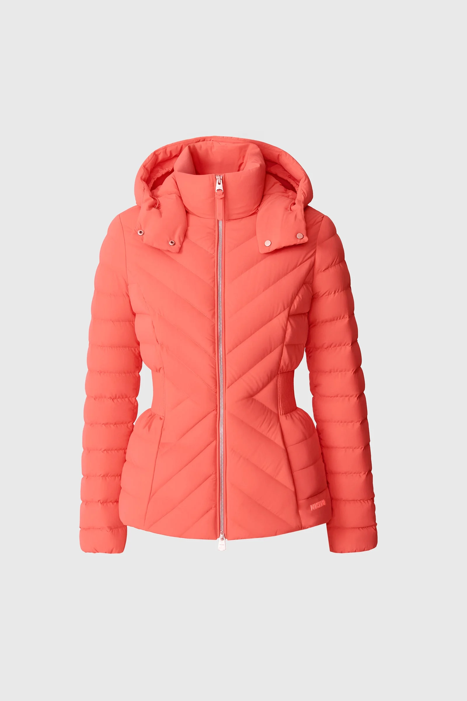 IDALEE is a light down jacket crafted from recycled nylon and filled with GRS-certified recycled down. Designed with a streamlined silhouette and quilting, the shell is water-resistant and waterproof. Features a stand collar and removable hood offering flexibility for varying weather conditions. The smocking detail at waist provides a tailored fit, while the fully lined interior ensures warmth down to -5°C. Perfect for colder days with a sleek, contemporary look. DETAILS - Light down hooded jacket - GRS-certified recycled down - 2-way stretch material - Stand collar with removable hood - Center front zipper closure - Elasticized waist detail - Down-filled insulation - Inner welt pocket with hidden zipper - MACKAGE silicone logo at hem - Temperature rating: -5° SIZE & FIT - SEMI-FITTED – Follows your body’s shape for ease of movement. - Designed to layer with a fitted top or light sweater. - The model is 5'11" (180 cm) and wears a size S. - Coat length from shoulder to hem: 25'' / 64 cm. COMPOSITION & CARE - Shell: 82% recycled nylon, 18% elastane/spandex. Lining : 100% recycled nylon. Filling: 90% GRS-certified down, 10% feathers. Water repellant & water resistant. - Dry clean by a leather specialist using only oil-based solvent. Do not use perchloroethylene.