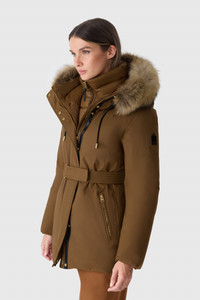 JENI-F is a 2-in-1 recycled down Nordic Tech parka for women with a removable lustrous down bib, natural fur trim, and adjustable storm visor hood. The structured, semi-fitted cut is accented with a ruched Velcro clasp belt. Designed for maximum comfort and protection on the coldest days, the proprietary bonded weave, storm placket, and insulated pockets add extra warmth. A high-performance staple with modern versatility. DETAILS - Three-quarter down parka - Traceable duck down - Recycled down - 800 fill powder - Deep Cold: Down to -20°C - Removable lustrous light down bib with stand collar - finland raccoon fur trim around collar - Nordic Tech weave for ultimate warmth - Hood with adjustable storm visor - Center front zip with storm placket - Hidden snaps with leather welt - Ruched elastic belt with branded Velcro clasp - Insulated zip waist pockets - Storm cuffs - Signature M logo patch on left sleeve - Semi-fitted for shape and ease SIZE & FIT - SEMI-FITTED – Follows your body’s shape with ease. - Designed to be worn with light layers. - Coat length from shoulder to hem: 29.5'' / 74.93 cm. COMPOSITION & CARE - Shell : 59% polyamide/nylon, 41% polyester. Combo 100% cow leather. Lining : 100% polyamide/nylon. Filling: 90% duck down, 10% feathers. Fur: 100% finland raccoon. Water-repellent & water-resistant. - Dry clean by leather specialist using oil based solvent only. Do not use perchloroethylene.