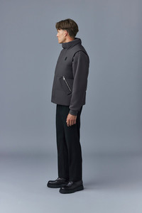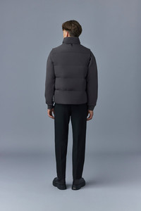 JOSEPH is a recycled down vest for men made with our proprietary 2-layer Nordic Tech shell. A streamlined cut that is easily layered, the ample funnel collar and hidden snap storm placket protect from the elements. Secure dual-entry zip flap pockets are insulated for comfort. Oversized channel quilting and a signature M add detail. - Down vest - 100% recycled down - 2-layer Nordic Tech shell with TPU membrane - Oversized channel quilting - Funnel collar - Centre front zip closure with (R) Leather tape - Storm placket with hidden snaps - Insulated dual-entry waist pockets with zip flaps - Adjustable drawcord at hem - Signature M logo at left chest - Classic fit SIZE & FIT - REGULAR – Classic fit allowing comfort and style. - Designed to be worn with heavier layers. - Coat length from shoulder to hem: 30'' / 76.2 cm. COMPOSITION & CARE INSTRUCTIONS - Shell : 59% polyamide/nylon, 41% polyester. Combo (In-visible): 100% cow leather. Lining : 100% polyamide/nylon. Filling : 90% duck down, 10% feathers. - Dry clean by leather specialist using oil based solvent only. Do not use perchloroethylene.