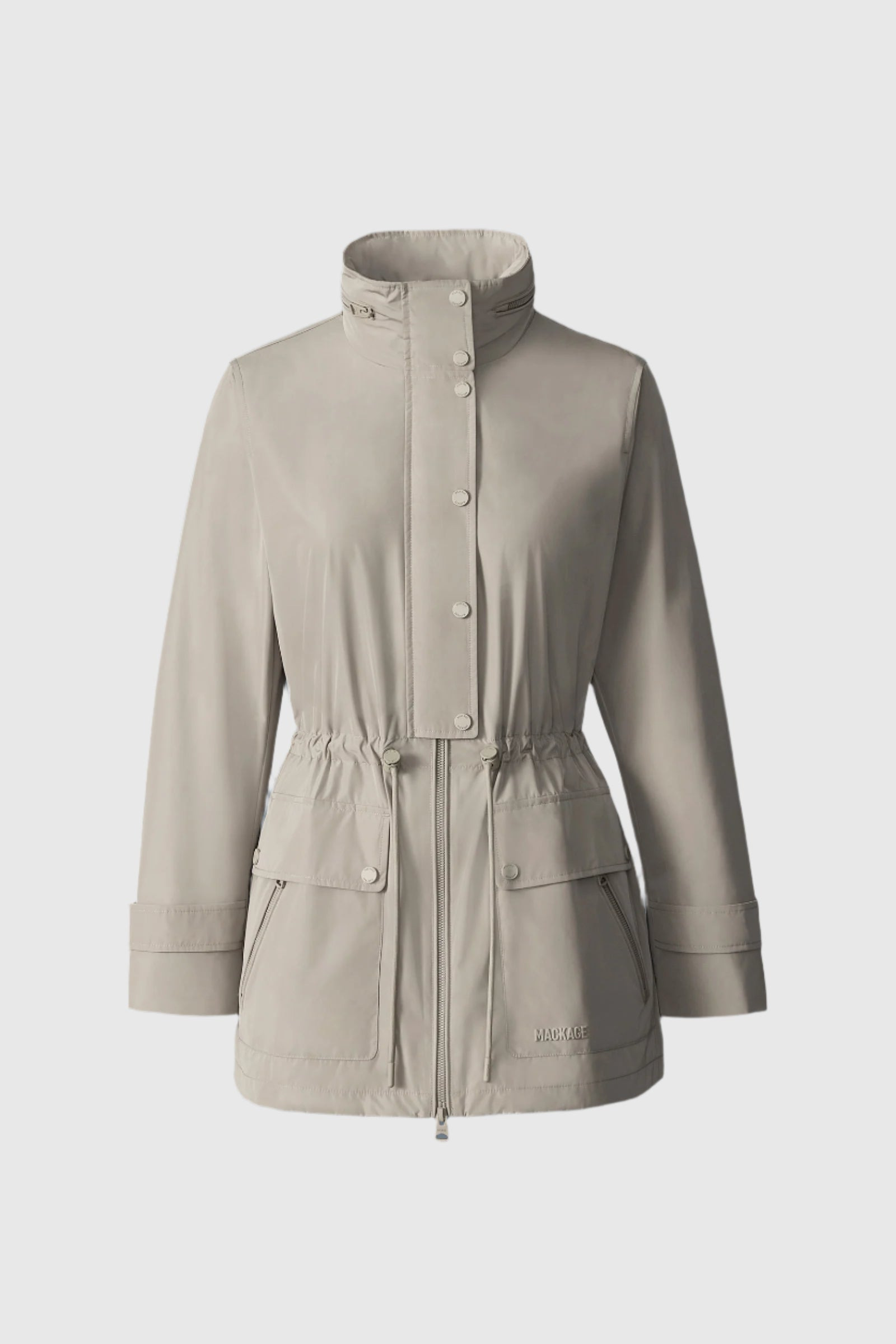 KERYN is a sustainable, medium-length jacket crafted from 100% recycled polyester. Featuring a relaxed silhouette with functional details, this jacket includes a stand collar with a packable hood and double-entry patch pockets, making it ideal for urban and outdoor wear. Designed with adjustable elements for a personalized fit, this piece combines versatility with a modern aesthetic. Lined with incredilby warm jersey for colder days. An adaptable and stylish layer for a range of conditions. DETAILS - Medium-length rain jacket - 100% recycled polyester - Center front zipper closure - Double entry patch pocket at waist with flap and snap - Inner welt pocket with zipper - Adjustable drawcord at waist - Adjustable sleeve cuff with snap - MACKAGE silicone branding at pocket - Stand collar with packable hood - Rain shedder at back - Body lined with jersey SIZE & FIT - RELAXED – Loose fit for on the go comfort. - Designed to be worn with heavier layers. - The model is 5'11" (180 cm) and wears a size S. - Coat length from shoulder to hem: 29 ¼'' / 75 cm. COMPOSITION & CARE - Shell: 100% recycled polyester. Lining: 100% polyester. Water repellant & water resistant. - Dry clean by a leather specialist using only oil-based solvent. Do not use perchloroethylene.
