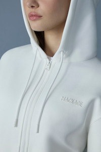 KRYSSA is a zip-up hoodie made from double-face jersey. The rib knit cuffs and hem provide an enhanced fit for better warmth and comfort, while the hood's drawcord offers adjustable coverage. Zippered waist pockets secure your essentials, and the "MACKAGE" logo at chest adds subtle brand flair. Partially lined with a sleek design for essential everyday functionality. DETAILS - Double-face hoodie with front zipper - Rib knit cuffs and hem - Adjustable drawcord hood - Centre front zipper closure - Waist pockets with zippers - Signature "MACKAGE" silicone logo at chest - Partially lined - Machine washable SIZE & FIT - RELAXED – Loose fit for on the go comfort. - Designed to be worn with heavier layers. - The model is 5'11" (180 cm) and wears a size S. - Length from shoulder to hem: 23'' / 58 cm. COMPOSITION & CARE - Shell: 53% cotton, 47% polyester. Combo: 72% polyamide/ nylon, 27% polyester, 1% elastane/spandex. Lining: 100% cotton. - Wash in domestic or commercial machine in water not exceeding 30°C at normal setting. Wash inside out. Use mild detergent. Wash with similar colors. Remove immediately after washing. Do not tumble dry. Iron with or without steam by hand, or press on commercial equipment, at low temperature (not exceeding 110°C). Do not bleach. Dry clean using oil-based solvent only. Do not use perchloroethylene.