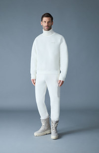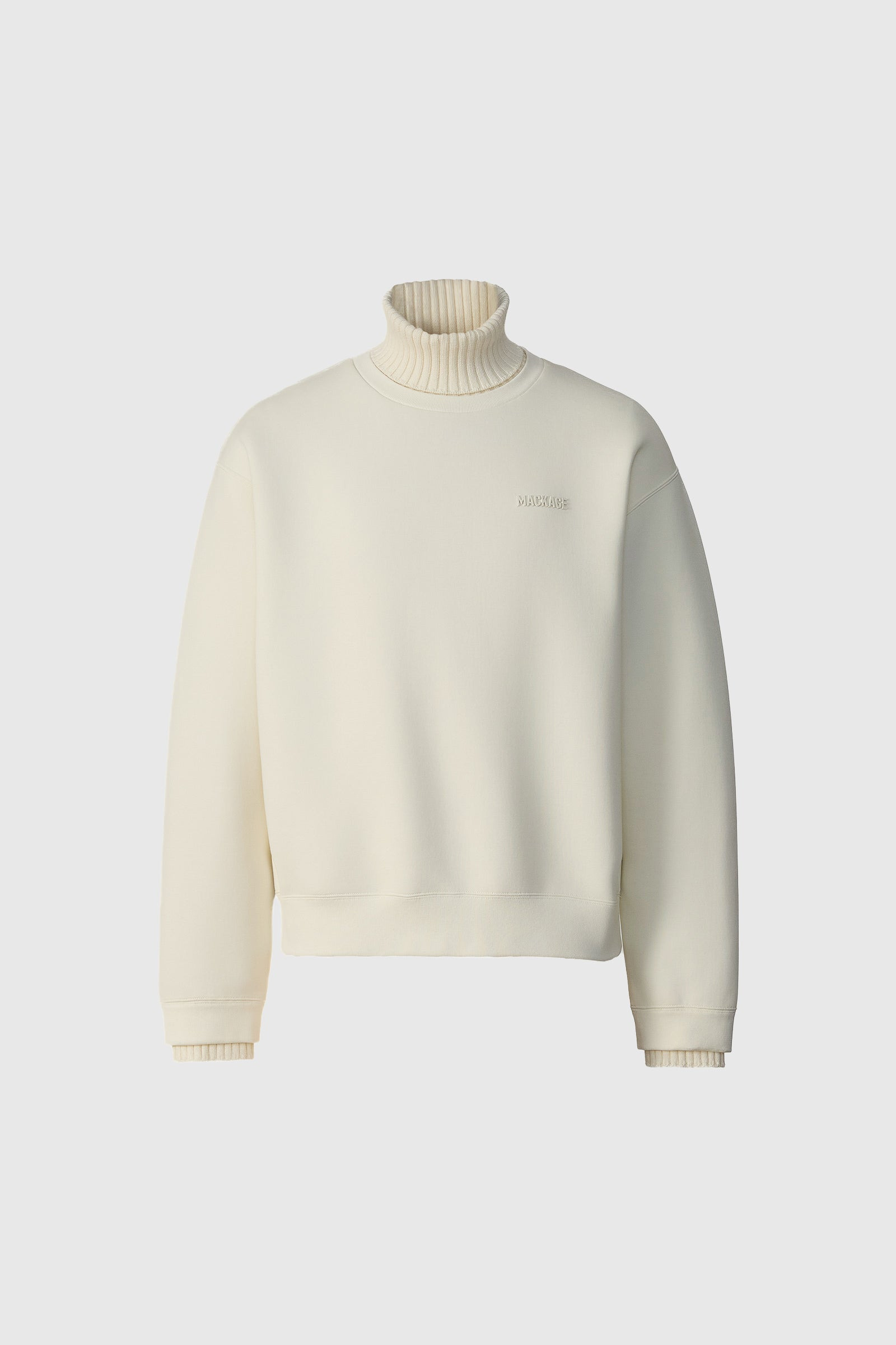 LEGEND is a double-face jersey turtleneck featuring a double roll collar and sleeve cuff crafted in a 7gg soft wool blend rib. It is finished with tonal ribs at collar, cuff and hem and with MACKAGE silicone branding on the chest. A modern wardrobe essential with a soft structure and everyday ease. DETAILS - Double-face jersey turtleneck - Soft wool blend double roll rib knit turtleneck collar - Tonal rib knit crew neck collar, cuff, and hem - "MACKAGE" silicone branding on chest - Unlined construction - Machine washable - Relaxed fit - Short length SIZE & FIT - RELAXED – Loose fit for on the go comfort. - Designed to be worn with heavier layers. - The model is 6'2" (187 cm) and wears a size L. - Coat length from shoulder to hem: 26'' / 81 cm. COMPOSITION & CARE - Shell: 53% cotton, 47% polyester. - Wash in domestic or commercial machine in water not exceeding 30°C at normal setting. Wash inside out. Use mild detergent. Wash with similar colors. Remove immediately after washing. Do not tumble dry. Iron with or without steam by hand, or press on commercial equipment, at low temperature (not exceeding 110°C). Do not bleach. Dry clean using oil-based solvent only. Do not use perchloroethylene.