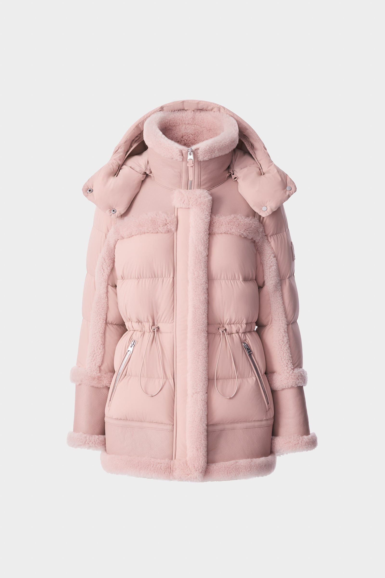 LILIBETH is a mixed-media recycled quilted down parka with plush shearling detailing throughout. Water-resistant and repellent, a storm visor hood and adjustable bungee at waist add utilitarian performance and create a striking silhouette. Expertly tailored, a hybrid winter staple with a contemporary cut. DETAILS - Mid-length mixed media quilted down parka - Shearling-trimmed stand collar with removable hood - Shearling trim around back yoke, bottom hem and sleeve hems - Center front zip closure with leather tape - Shearling detailed placket - Insulated zip waist pockets - Signature M logo patch on left sleeve - Relaxed fit - Down to -15°C SIZE & FIT - REGULAR – Classic fit allowing comfort and style. - Designed to be worn with heavier layers. - The model is 5'11" (180 cm) and wears a size XS. - Coat length from shoulder to hem: 29.75'' / 76 cm. COMPOSITION & CARE - Shell: 82% recycled nylon, 18% elastane/spandex. Combo shell: 100% sheepskin. Combo: 100% lamb leather. Lining: 82% recycled nylon, 18% elastane/spandex. Filling: 90% duck down, 10% feathers. Water-repellent and water-resistant. - Dry clean by leather specialist using oil-based solvent only. Do not use perchloroethylene.