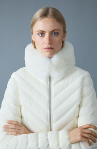VIK is a fitted diamond quilted jacket crafted from a high-performance stretch shell. Engineered with GRS-certified recycled down, it delivers warmth without bulk. Functional details include an adjustable waist tab at the back with snaps, a stand collar, and elasticized cuffs for a snug fit. A sleek, versatile silhouette designed for transitional layering. DETAILS - Long down chevron quilted coat - Lightweight stretch recycled nylon - Water-repellent and resistant - GRS-certified recycled down - Removable shearling collar - Smocked elasticized detail - 2-way center front zipper closure - Pocket with hidden zipper - Quilted sleeves and lining - MACKAGE silicone branding - Inner welt pocket with zipper - Piping detail - Fully lined - Machine washable - Temperature rating: -5°C SIZE & FIT - FITTED – Our signature fit, closest to the body. - Designed to be worn with light layers, all while keeping you warm. - For heavier layering, we recommend sizing up. - The model is 5'11" (180 cm) and wears a size S. - Coat length from shoulder to hem: 36'' / 67 cm. COMPOSITION & CARE - Shell: 82% recycled nylon, 18% elastane/spandex. Lining: 82% recycled nylon, 18% elastane/spandex. Filling: 85% recycled down, 15% recycled feathers. Water-repellent, water-resistant. - Close zippers. Remove fur. Remove all removable trims. Wash inside out. Wash in domestic machine in water not exceeding 40°c, at normal setting. Use mild detergent. remove immediately after washing. Do not soak. Tumble dry low heat with tennis balls, until fully dried (1to 3 hours). Do not wet-clean. Do not bleach. Do not wring. Do not iron or press. Dry clean using oil based solvent only. Do not use perchloroethylene.