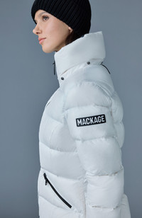 MADALYN is a recycled nano down jacket for women with a removable storm visor hood. Lightweight and tailored to a classic fitted silhouette, the high-sheen channel quilt shell delivers perfect warmth through the seasons. Rib knit cuffs and insulated zip pockets lend comfort. 3D zip pull covers and our signature wordmark add defining detail. DETAILS - Light nano down jacket - 100% recycled down - Lustrous nylon shell - Channel quilting - Removable hood - Adjustable drawcord storm visor - Centre front zip closure - Rib knit storm cuffs - Insulated zip waist pockets with 3D pull covers - Inside pocket - Contrast lining - Signature wordmark patch on left sleeve - Machine washable - Signature closest-to-the-body fit SIZE & FIT - FITTED – Our signature fit, closest to the body. - Designed to be worn with light layers, all while keeping you warm. - For heavier layering, we recommend sizing up. - Coat length from shoulder to hem: 24.5'' / 62.23 cm. COMPOSITION & CARE - Shell : 100% polyamide/nylon. Lining : 100% polyamide/nylon. Filling: 90% duck down, 10% feathers. Water-repellent & water-resistant. - Close zippers. Remove leather zipper puller. Wash inside out. Wash in domestic or commercial machine in water not exceeding 40°C, at normal setting. Use mild detergent. Remove immediately after washing. Tumble dry low heat with tennis balls, until fully dried (1 to 3 hours). Do not soak. Do not wet-clean. Do not bleach. Do not wring. Do not iron or press. Do not dry clean.