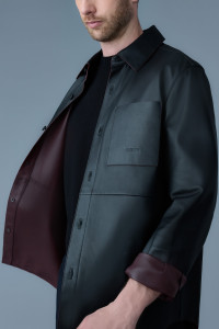 REMINGTON is an unlined overshirt made from luxurious two-tone colored leather. Sharply tailored, it features a classic collar and front button closure. Raw edge construction with edge paint, matching the interior color of the two-tone leather, is noticeable at the collar, cuffs, and chest pocket. Classic ready-to-wear staple with subtle elevated detailing throughout. - Two-tone colored leather overshirt - Side seam pocket - Edge painted finishing - Classic collar - Debossed "MACKAGE" at patch pocket - Button front closure - Adjustable sleeve cuffs with buttons - Regular fit - Horn Buttons SIZE & FIT - REGULAR – Classic fit allowing comfort and style. - Designed to be worn with heavier layers. - The model is 6'2" (187 cm) and wears a size 40. - Coat length from shoulder to hem: 29.5'' / 75 cm. COMPOSITION & CARE INSTRUCTIONS - Shell: 100% lamb leather. - Dry clean by leather specialist using oil-based solvent only. Do not use perchloroethylene.