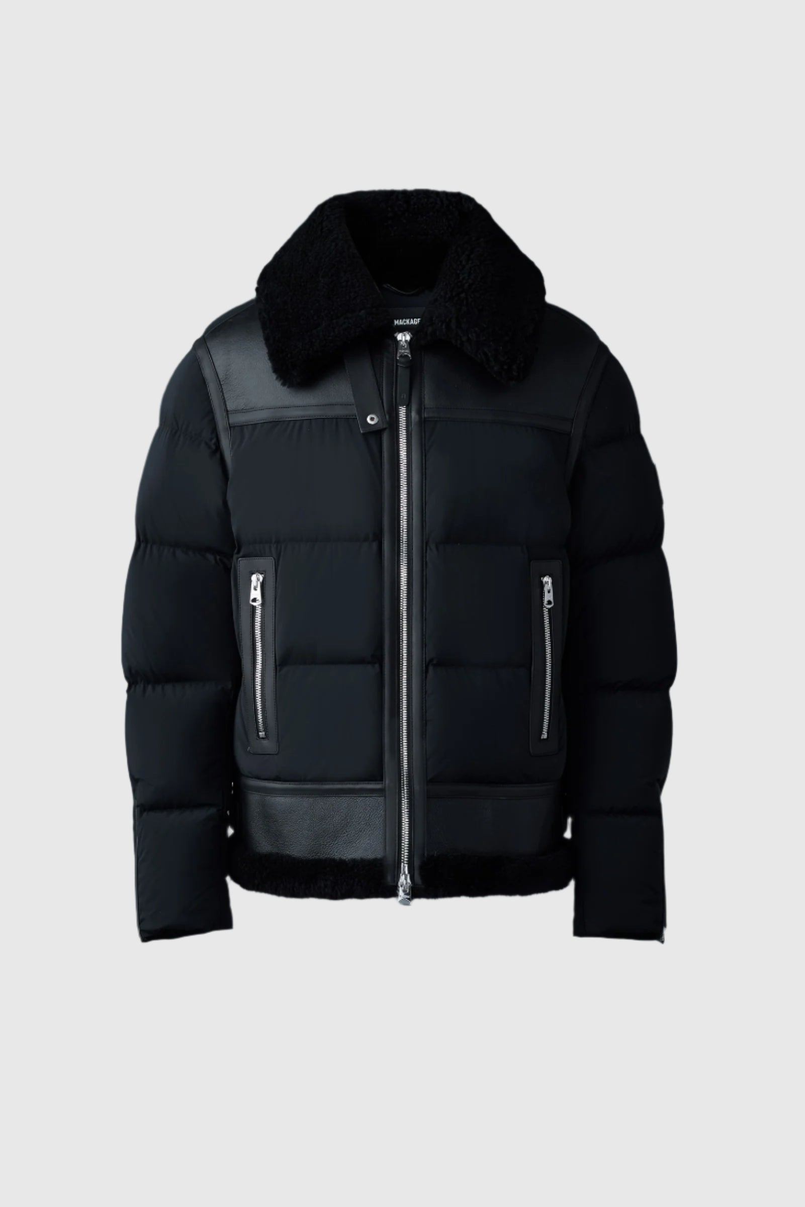 ROBERT is a sustainably made mixed-media recycled quilted down jacket with plush shearling paneling throughout. Water-resistant and repellent, the aviator style and leather tape detailing add striking lines to the regular cut. Expertly crafted, a hybrid winter staple with a contemporary design. DETAILS - Short mixed media quilted down jacket - 750+ fill power - Moderate Cold: Down to -20°C - Shearling-trimmed spread collar and bottom hem - Center front zip closure with leather tape - Insulated zip waist pockets - Signature M logo patch on left sleeve - Collar tab with snaps - Zipper vent at cuffs - Inner welt pockets with zippers - Adjustable waist tabs - Regular fit SIZE & FIT - REGULAR – Classic fit allowing comfort and style. - Designed to be worn with heavier layers. - The model is 6'2" (187 cm) and wears a size 40. - Coat length from shoulder to hem: 26.5'' / 67 cm. COMPOSITION & CARE - Shell: 82% recycled nylon, 18% elastane/spandex. Combo shell: 100% sheepskin. Combo: 100% lamb leather. Lining: 82% recycled nylon, 18% elastane/spandex. Filling: 90% duck down, 10% feathers. Water-repellent and water-resistant. - Dry clean by leather specialist using oil-based solvent only. Do not use perchloroethylene.