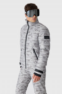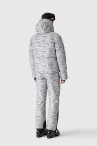 SAMUEL-JC is a down ski jacket made from jacquard camo shell with a removable hood and storm visor. It features a stand collar, concealed placket, and detachable powder skirt for added protection. Built for performance in temperatures down to -15°C. DETAILS - Technical down ski jacket - Temperature Rating: -15°C - Water-repellent and resistant - Water-resistant zippers at front and pockets - Hood with adjustable drawcord storm visor - Removable hood and stand collar - Concealed center front placket - Detachable powder skirt at waist - Adjustable sleeve cuffs with tab and Velcro - Active storm cuffs with thumbhole opening - Invisible zipper pocket at left sleeve seam - Inner welt pocket with zipper - Silicone ski patch at left sleeve - Made from recycled materials - Machine washable SIZE & FIT - REGULAR – Classic fit allowing comfort and style. - Designed to be worn with heavier layers. - The model is 6'2" (187 cm) and wears a size 40. - Coat length from shoulder to hem: 27'' / 70 cm. COMPOSITION & CARE - Shell: 100% polyester. Lining: 82% recycled nylon, 18% elastane/spandex. Filling: 90% down, 10% feathers. Water-repellent, water-resistant. - Close zippers. Remove fur. Remove all removable trims. Wash inside out. Wash in domestic machine in water not exceeding 40°c, at normal setting. Use mild detergent. remove immediately after washing. Do not soak. Tumble dry low heat with tennis balls, until fully dried (1to 3 hours). Do not wet-clean. Do not bleach. Do not wring. Do not iron or press. Dry clean using oil based solvent only. Do not use perchloroethylene.